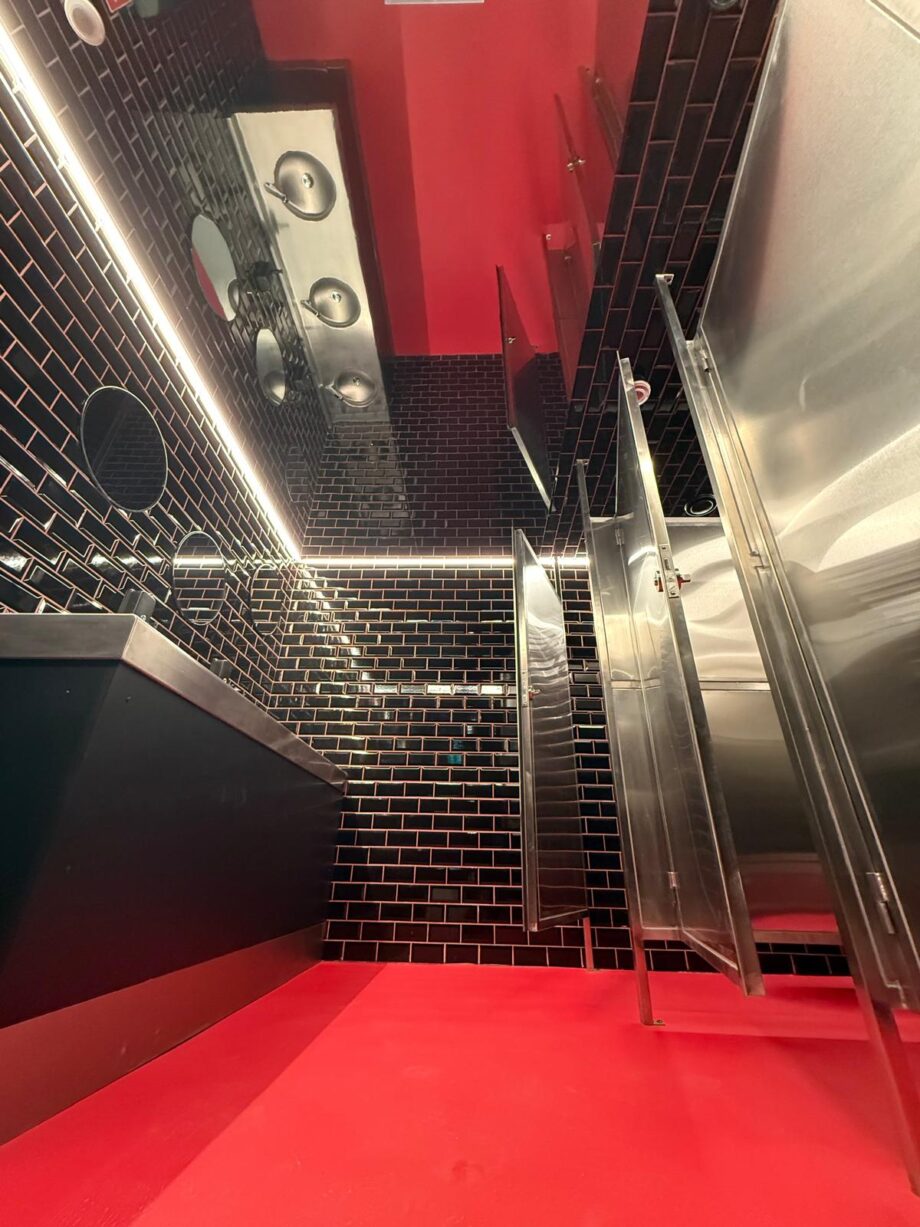 Une gigantesque anamorphose dissimule l’entrée des toilettes et intrigue dès le premier regard.