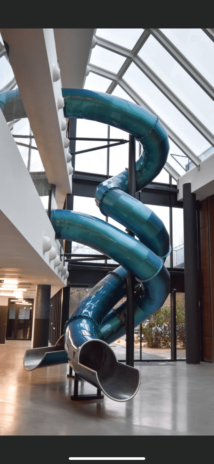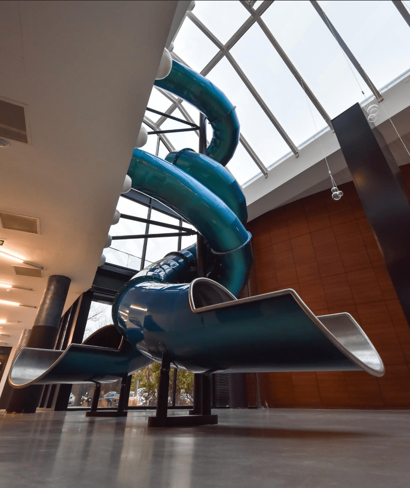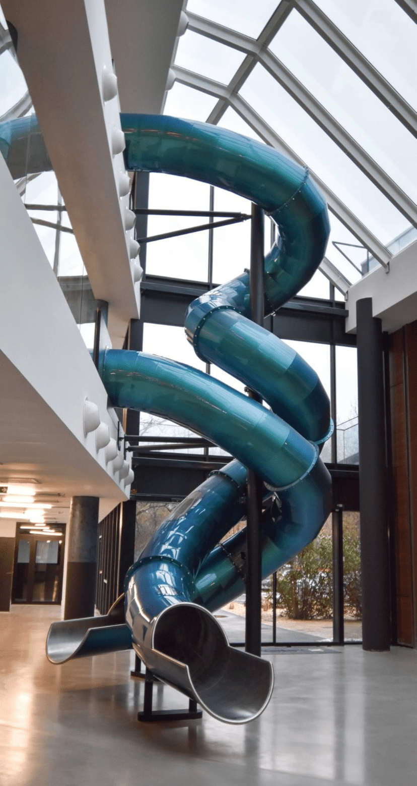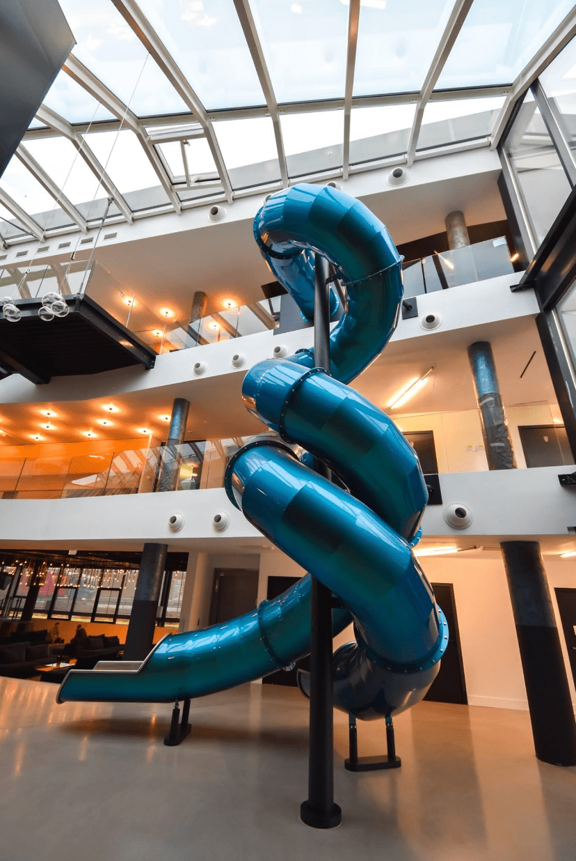 L’enjeu ? Placer les collaborateurs au cœur du projet et concevoir un espace qui transforme le travail en épanouissement quotidien. Salle de réunion, open‑spaces bien pensés, mais aussi fitness, zones de repos, restaurant d’entreprise… et pour finir la journée, quoi de mieux qu’un toboggan géant à deux tubes croisés ?