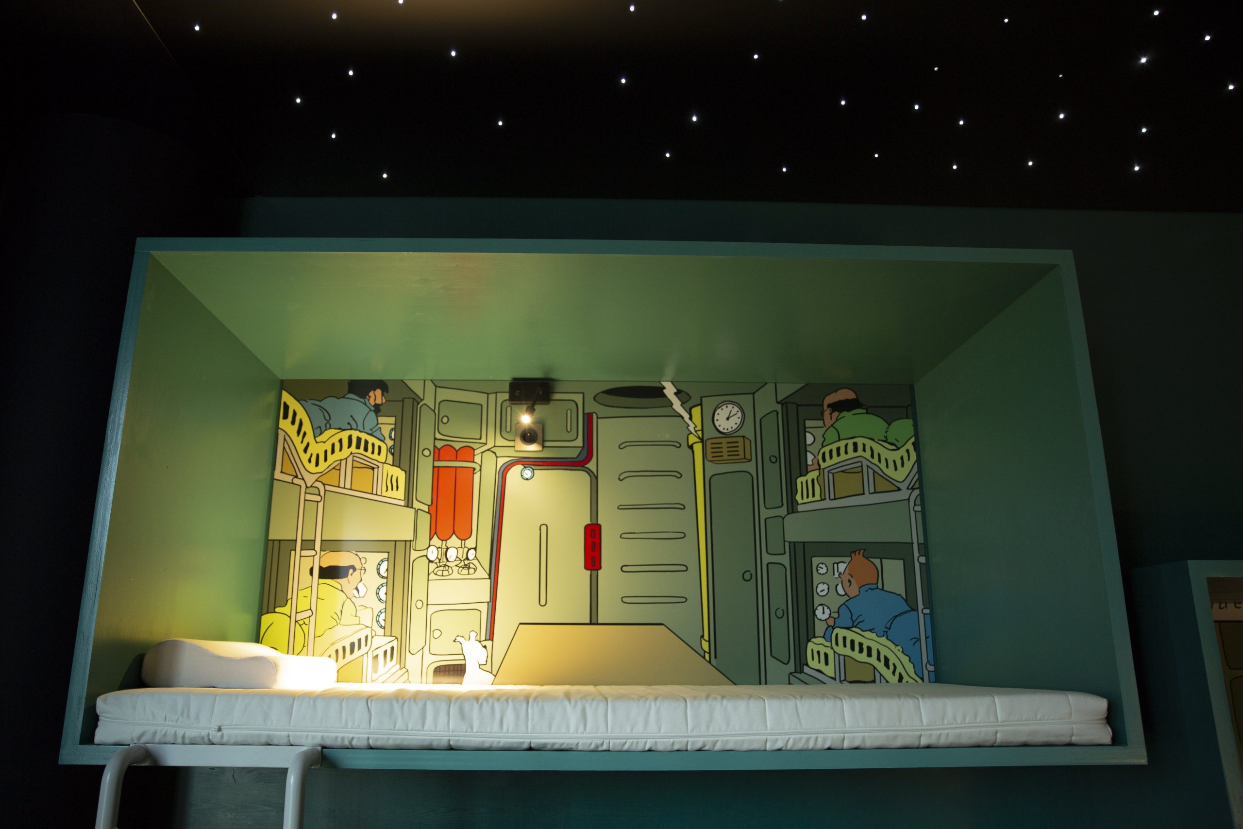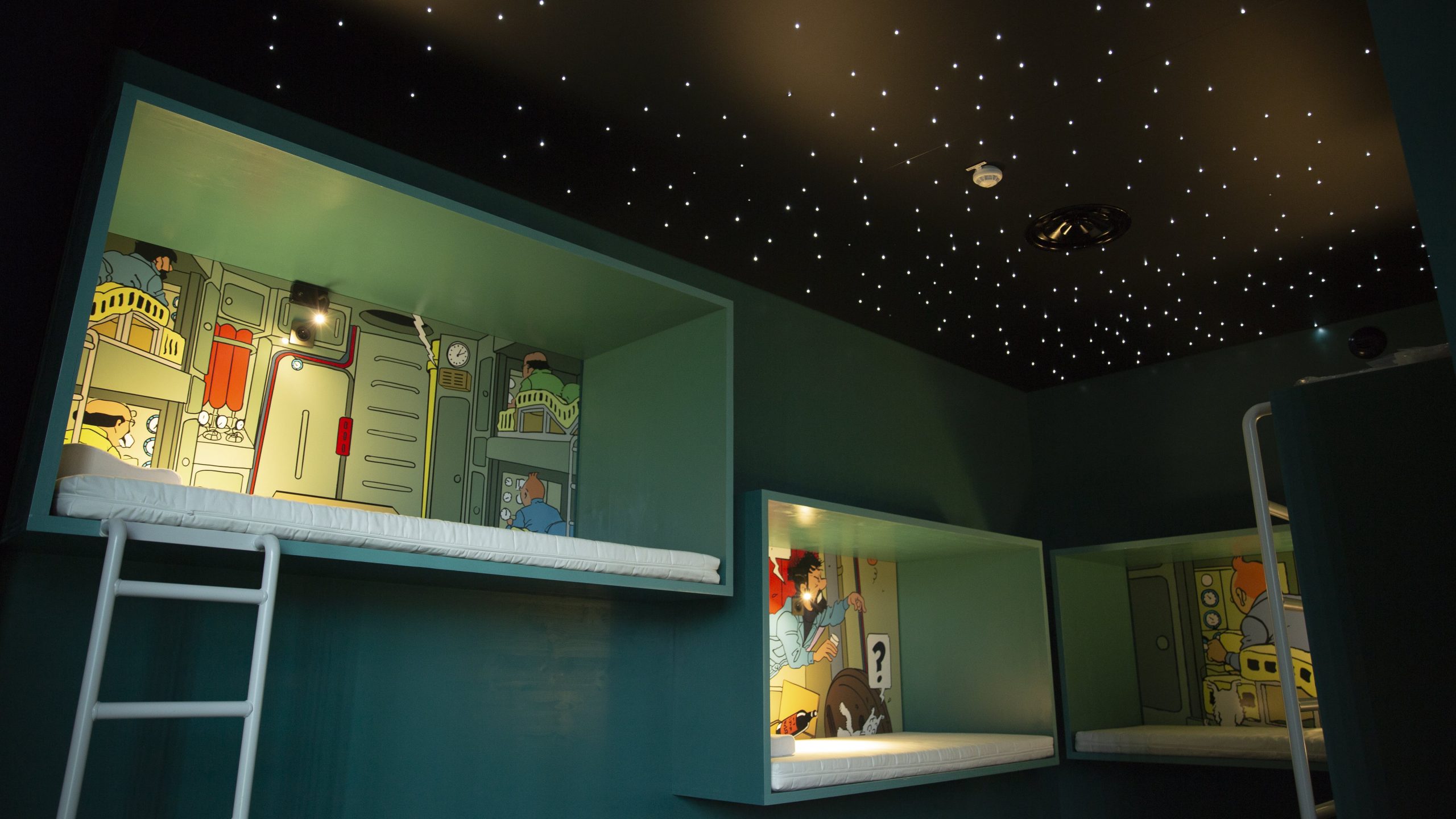 Espaces ludiques en clin d’œil : cabines de sieste inspirées de « On a marché sur la lune » (hello Tintin !), un toboggan double comme trait d’union vertical entre espaces de travail.