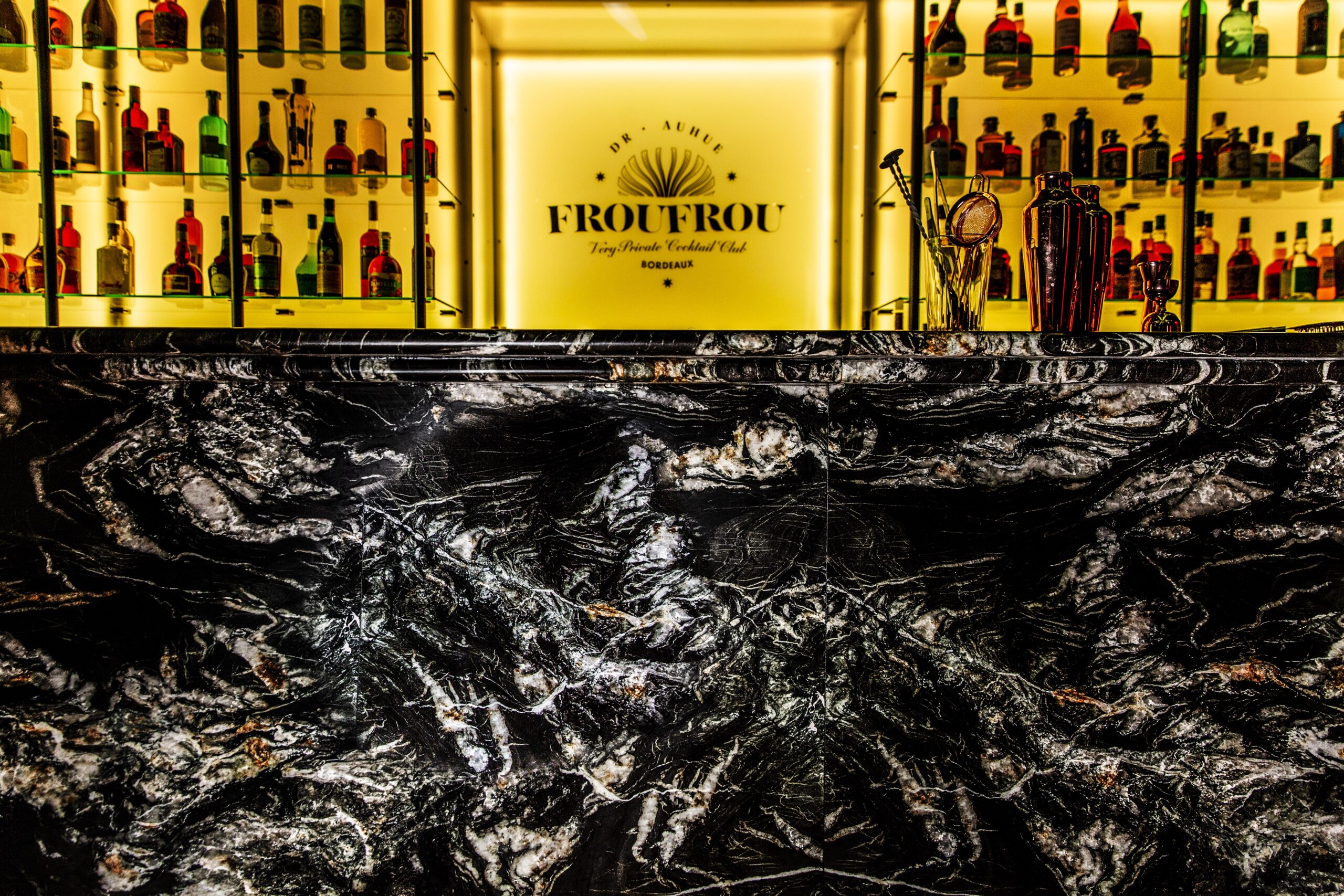 Le bar en marbre noir avec son veinage blanc s’impose comme une évidence dès que vous pénétrez dans l’antre du cocktail, l’arrière-bar en PMMA rétro-éclairé permet de créer une ambiance lumineuse incroyable et de mettre en avant le mur de bouteilles.