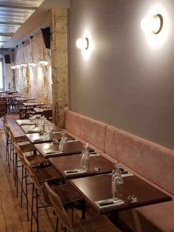 L’espace s’étire en longueur, du bar jusqu’à la cuisine semi-ouverte, en passant par une salle rythmée par des banquettes en velours, des coussins art déco, une végétation ponctuelle, et des jeux de profondeur soigneusement travaillés.