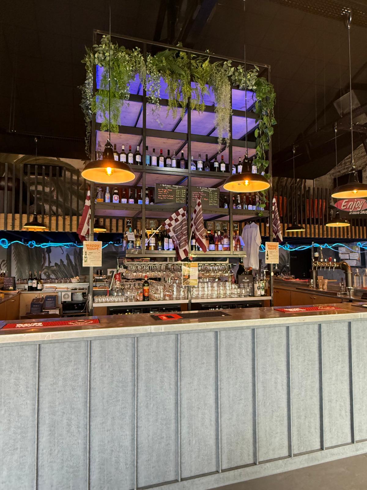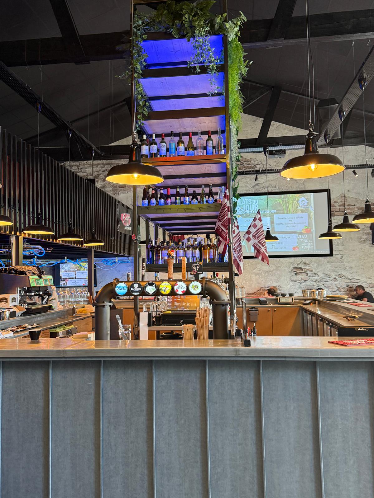 Le lieu prend racine dans un ancien entrepôt, à la périphérie d’un centre-ville. Nous avons assumé cette origine en poussant le style industriel jusqu’au bout : hauts plafonds noirs, chemins de câbles apparents, grande verrière, mur en pierre brut, et surtout un bar central monumental en métal, habillé de zinc et de chutes recyclées de la franchise Dal’Alu — un clin d’œil à la récup chic.