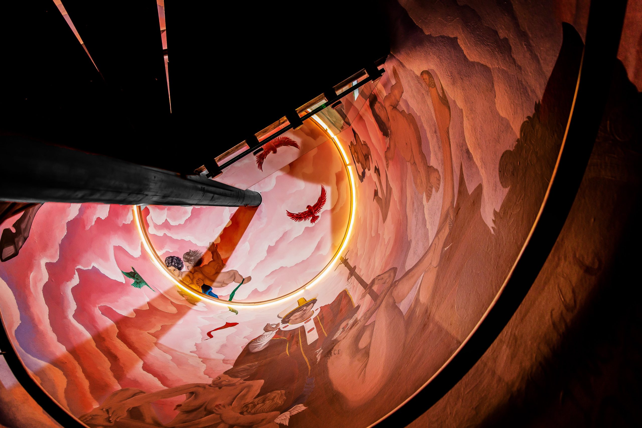 L’escalier turbine devient une œuvre en soi, rendant hommage à Diego Maradona dans une ambiance presque sacrée.
