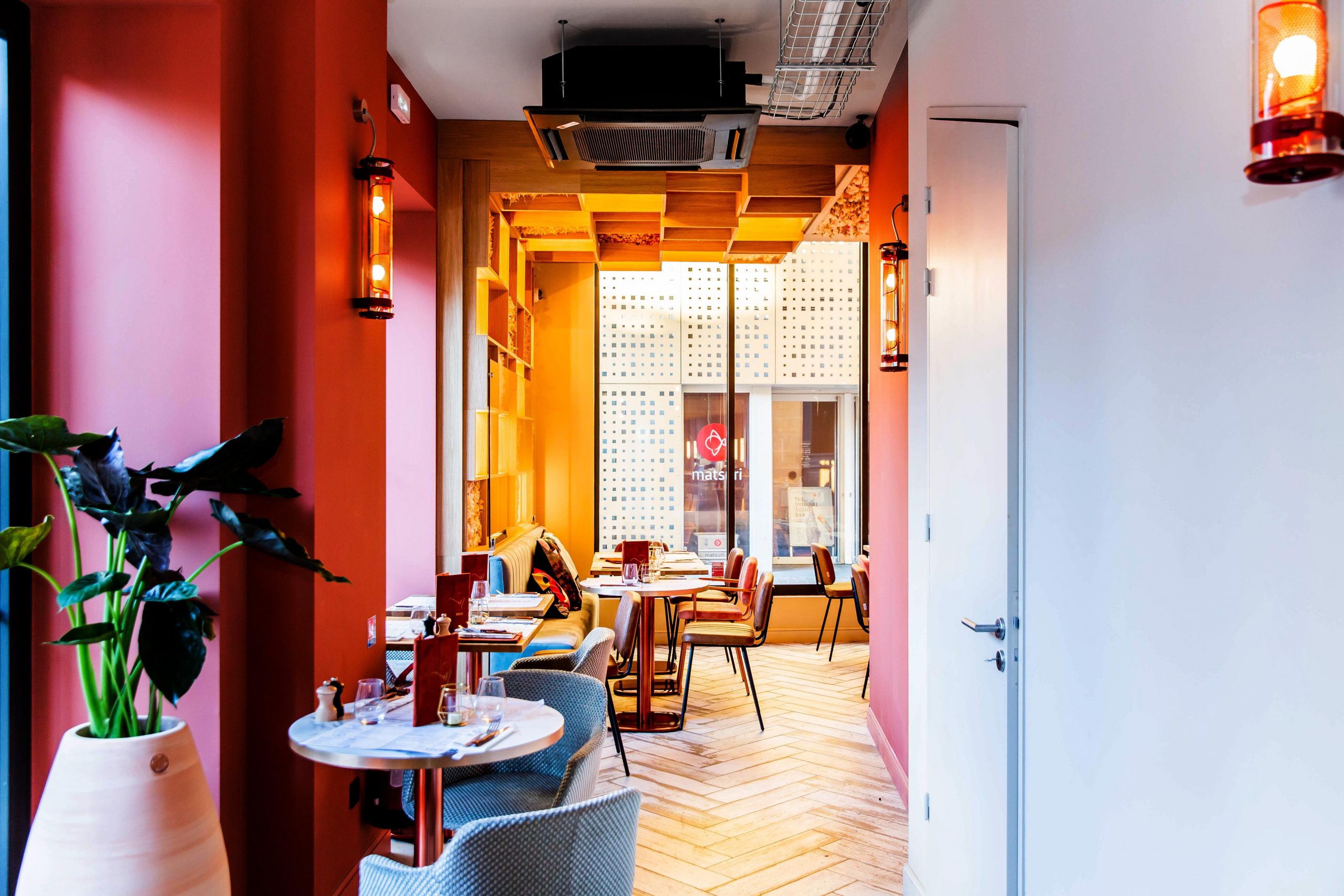Une table suspendue pour les tablées animées, des banquettes douillettes pour les duos — tout est contraste, tout est intention.