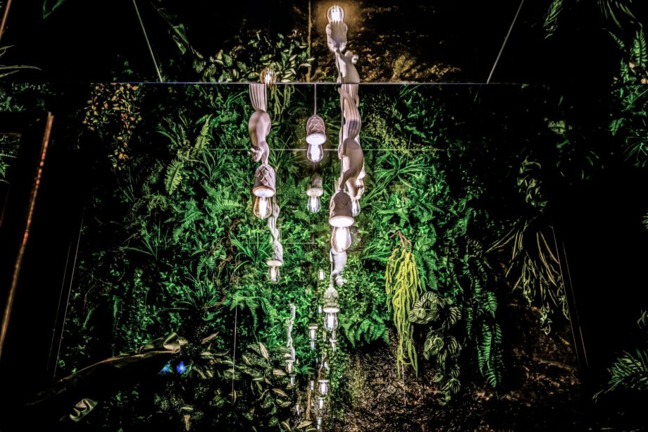 Dans les toilettes, une cascade et un mur végétal se reflètent dans des miroirs du sol au plafond, pour une immersion totale.