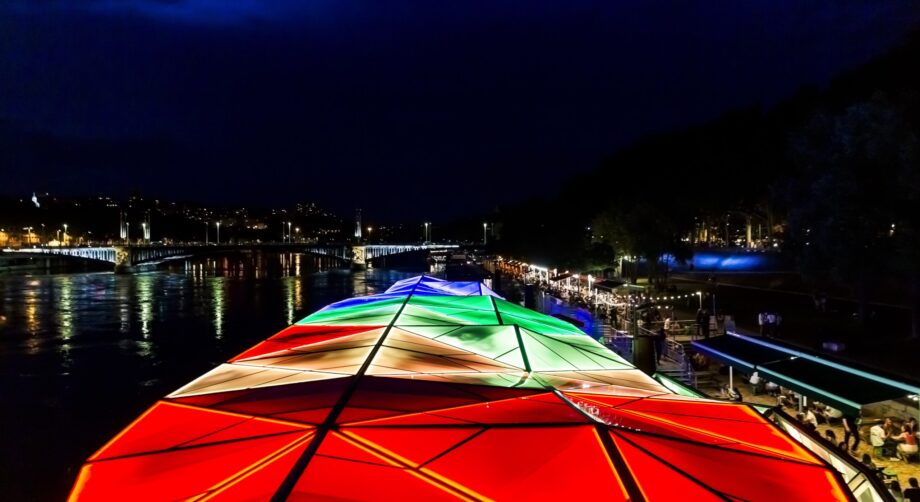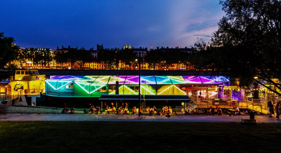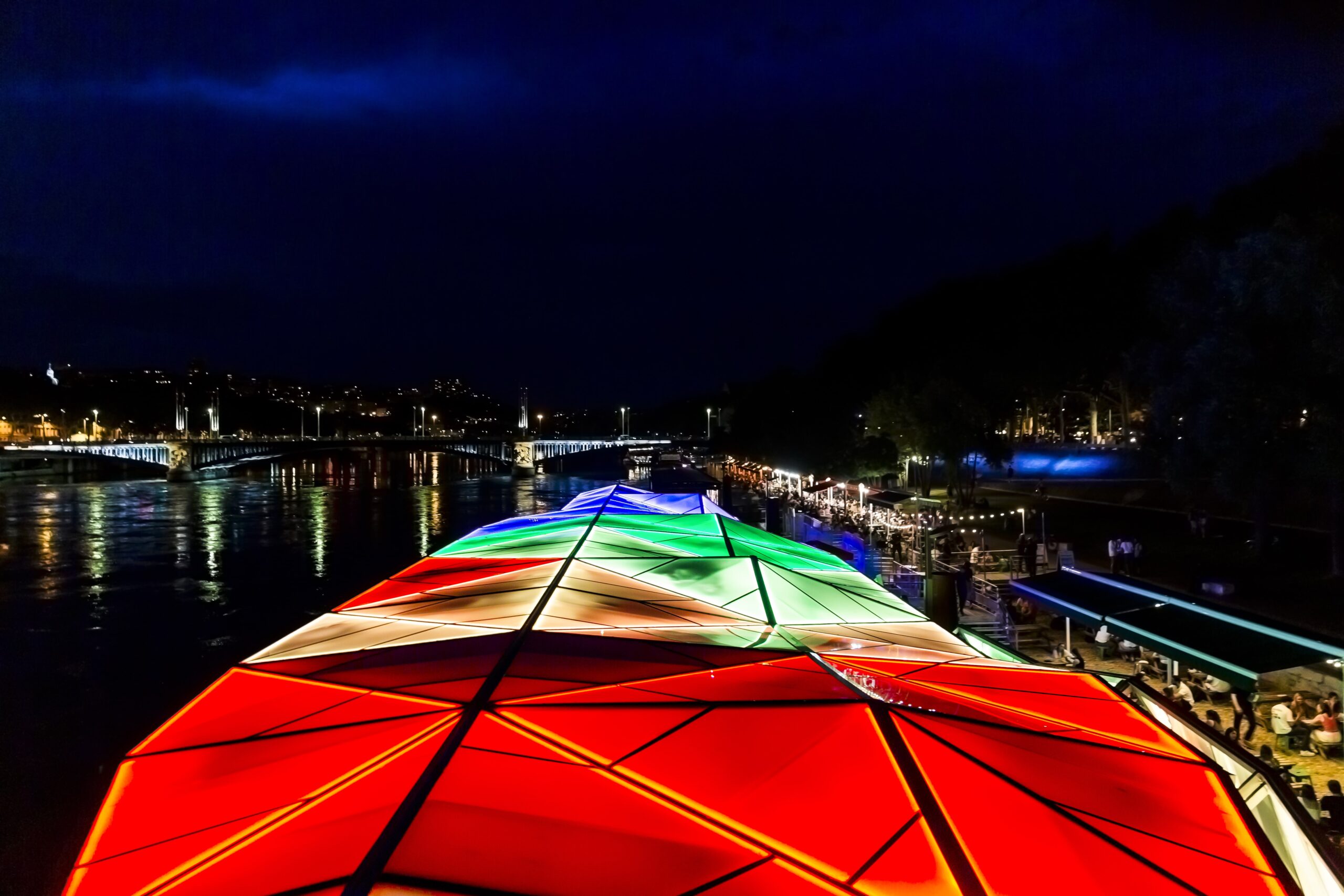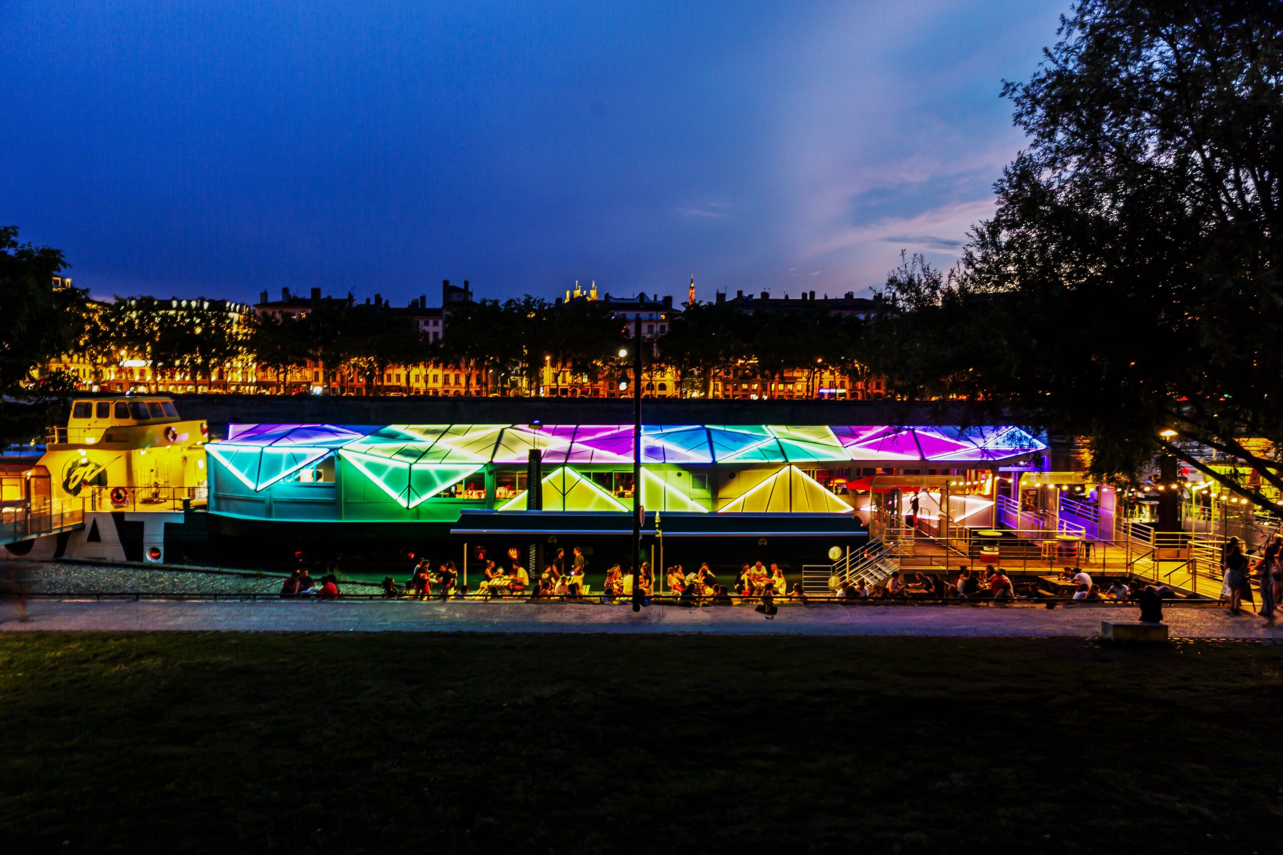 Ce bateau emblématique de la ville de lyon positionné sur les quais du Rhône face à l’hôtel Dieu avait été rénové en 2000 avec le positionnement d’un chapiteau sur le pont principal. Nous nous sommes inspirés de ce chapiteau et du musée des confluences pour imaginer une coque lumineuse en PMMA. Celle-ci est composé de triangles positionnés sur une structure métallique dans les angles concaves et convexes permettent de créer une dynamique exceptionnelle. Cette coque sera illuminée par des centaines de bandeaux led qui permettront d’imaginer des décors et des ambiances sans limites. Véritable clin d’œil aux fêtes de la lumières de LYON, le OZ BOAT s’intègrera sans complexe dans le paysage féérique de cette manifestation. À l’intérieur ambiance Australienne sur les pures codes Café OZ, 3 Bars, un espace dance floor de 600 m2 avec sa verrière et sa vue incroyable sur la presqu’île, un club privé dans la calle.
