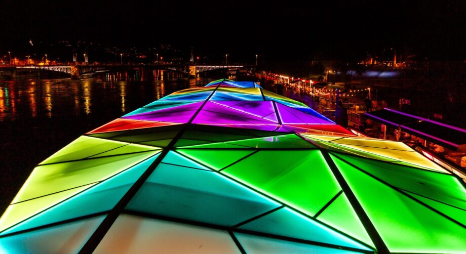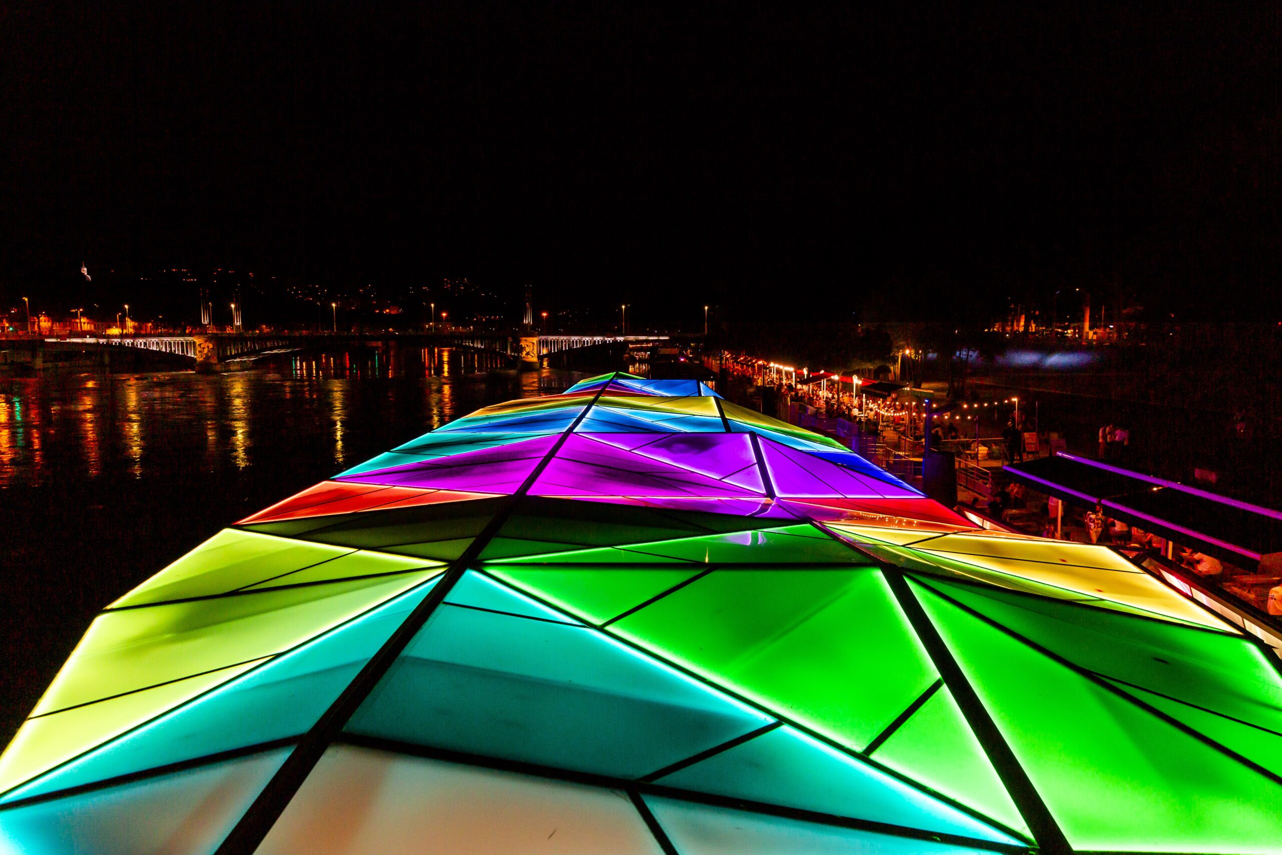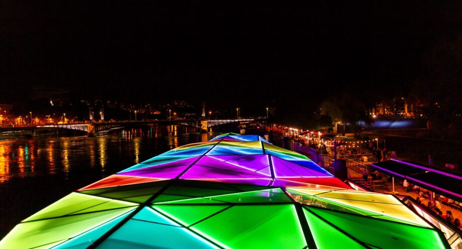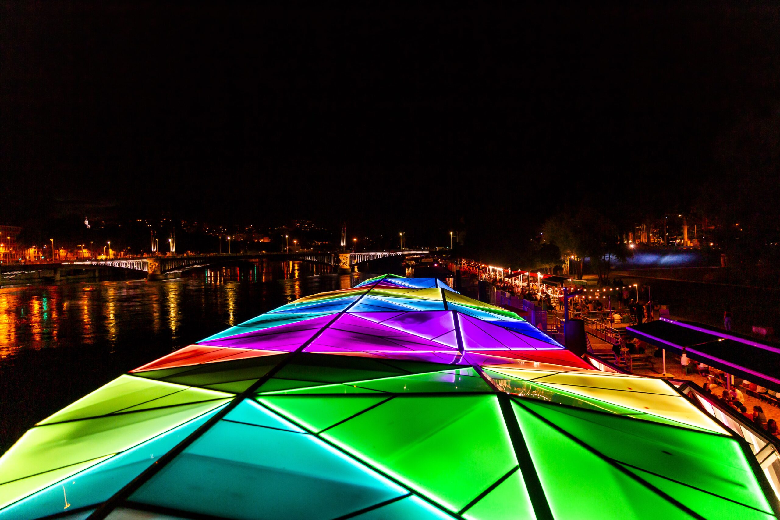 Ce bateau emblématique de la ville de lyon positionné sur les quais du Rhône face à l’hôtel Dieu avait été rénové en 2000 avec le positionnement d’un chapiteau sur le pont principal. Nous nous sommes inspirés de ce chapiteau et du musée des confluences pour imaginer une coque lumineuse en PMMA. Celle-ci est composé de triangles positionnés sur une structure métallique dans les angles concaves et convexes permettent de créer une dynamique exceptionnelle. Cette coque sera illuminée par des centaines de bandeaux led qui permettront d’imaginer des décors et des ambiances sans limites. Véritable clin d’œil aux fêtes de la lumières de LYON, le OZ BOAT s’intègrera sans complexe dans le paysage féérique de cette manifestation. À l’intérieur ambiance Australienne sur les pures codes Café OZ, 3 Bars, un espace dance floor de 600 m2 avec sa verrière et sa vue incroyable sur la presqu’île, un club privé dans la calle.