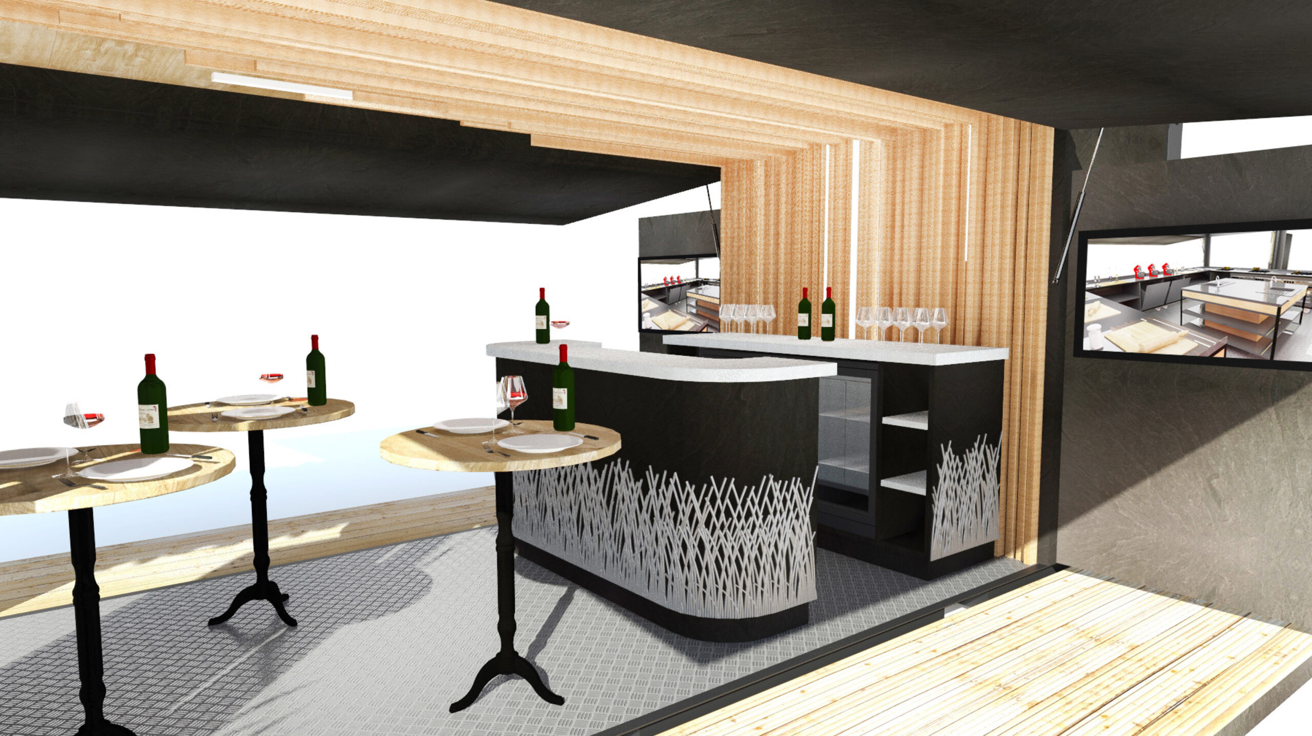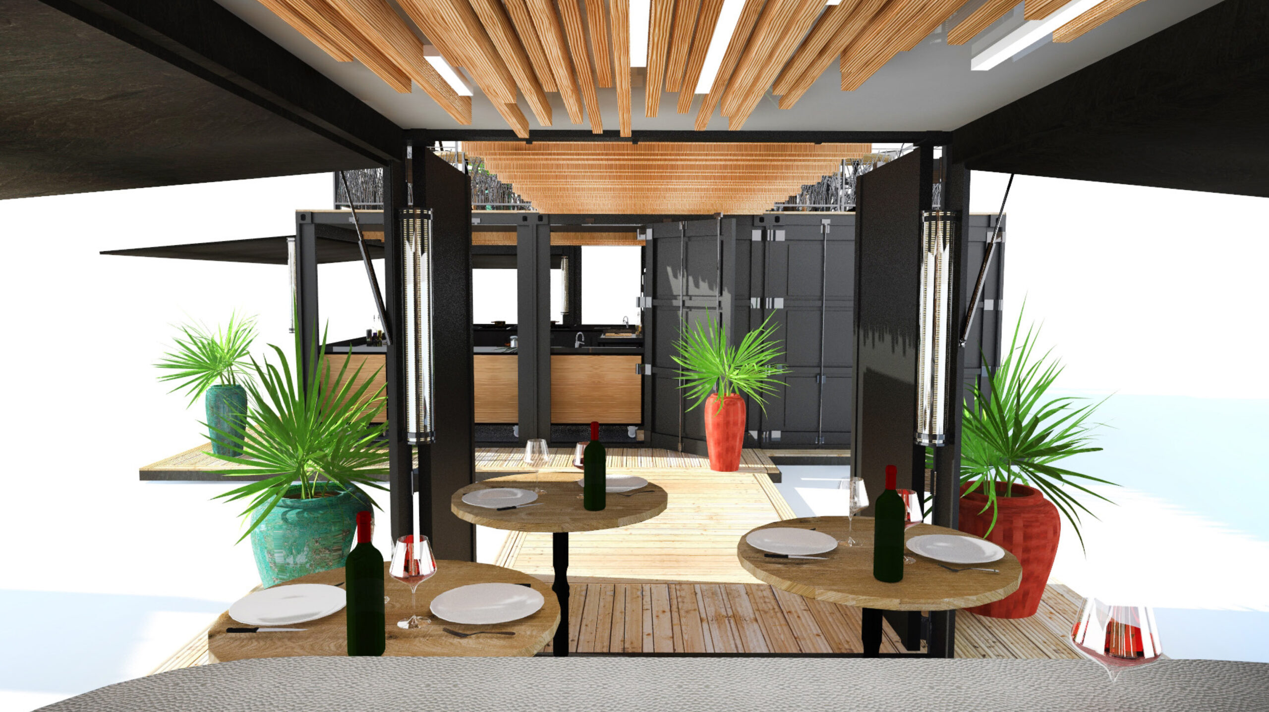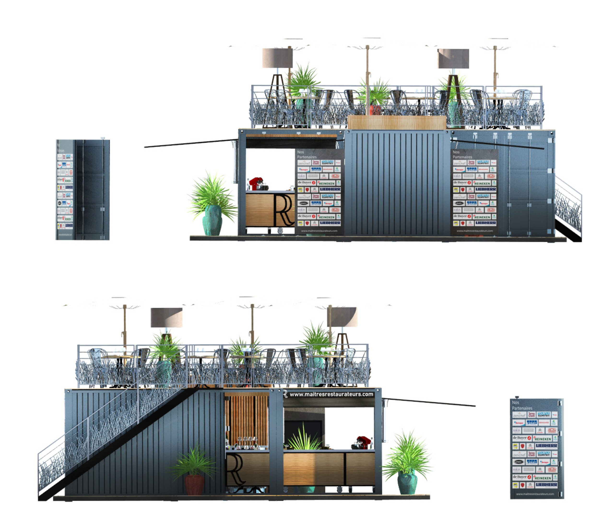 Créer un restaurant en associant 4 conteneurs de façon à obtenir une structure modulaire et transportable, capable de s’implanter sur les différents événements nationaux ou régionaux dédiés à la gastronomie française.