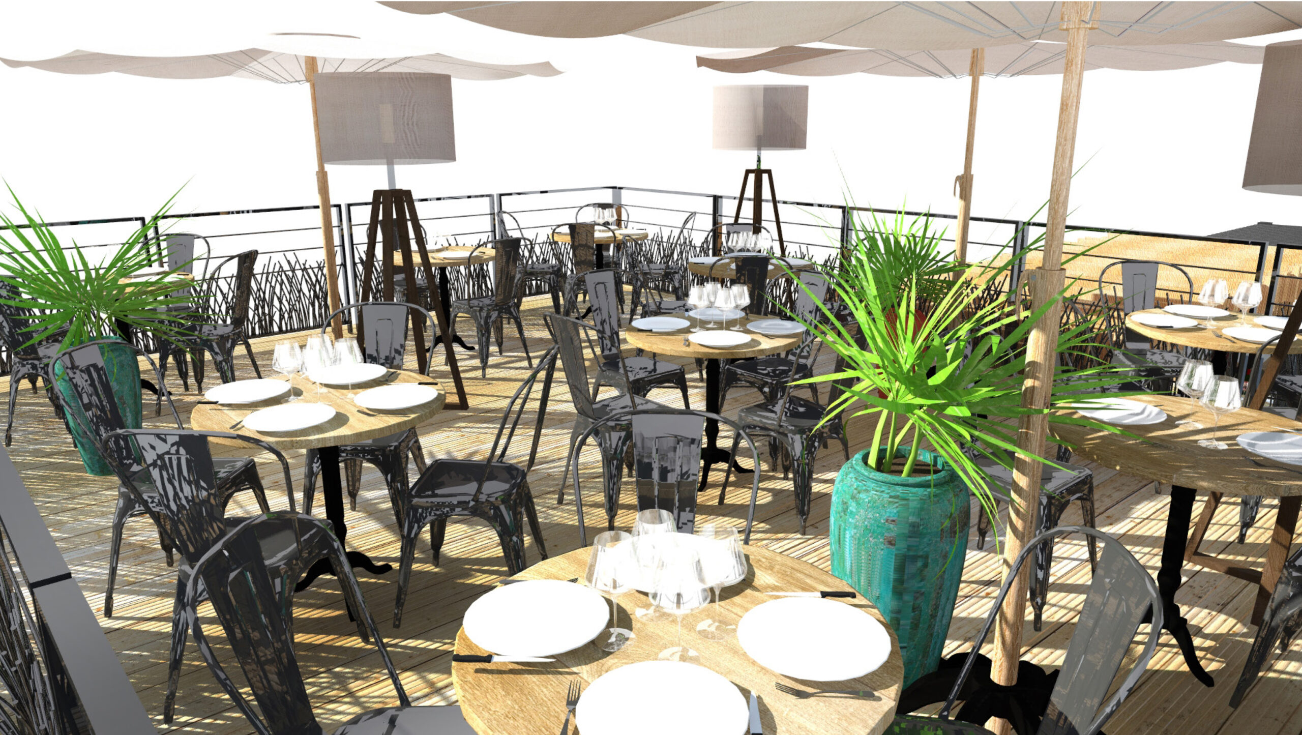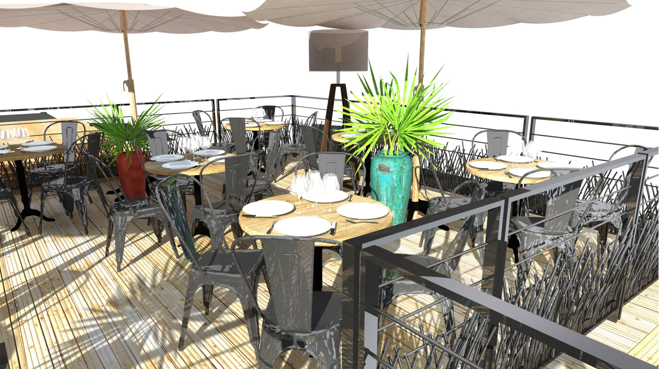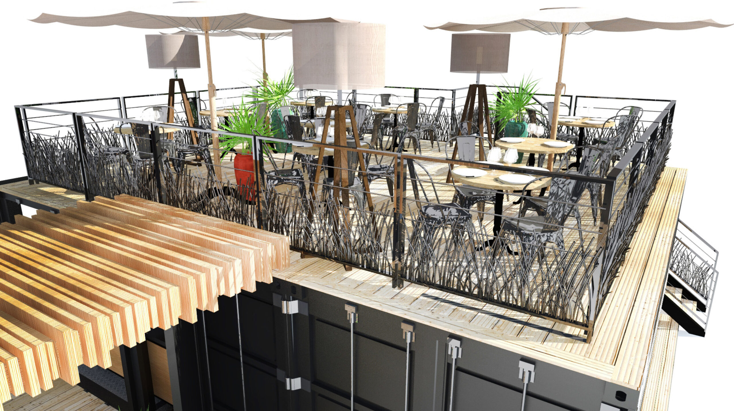 Le mobilier, les terrasses et les éléments de scénographie ont tous été pensés pour se démonter, s’imbriquer et se rangerdans les conteneurs : un défi d’ingéniosité et de design logistique.