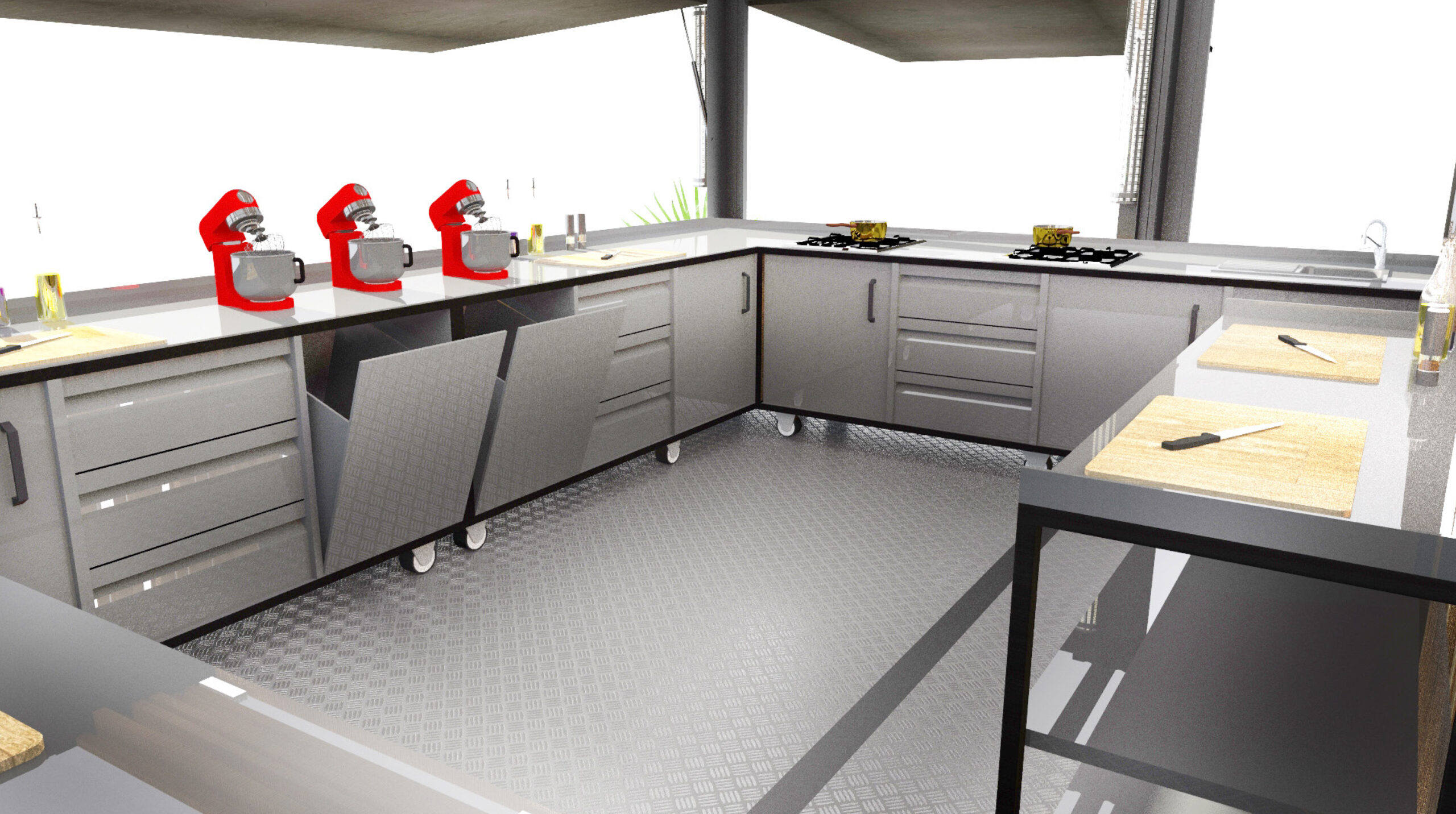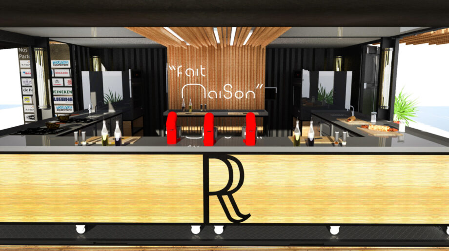 3 conteneurs sont assemblés pour former une grande cuisine de démonstration. Les chefs y cuisinent en direct devant le public, avec des caméras et écrans intégrés pour offrir une visibilité maximale.