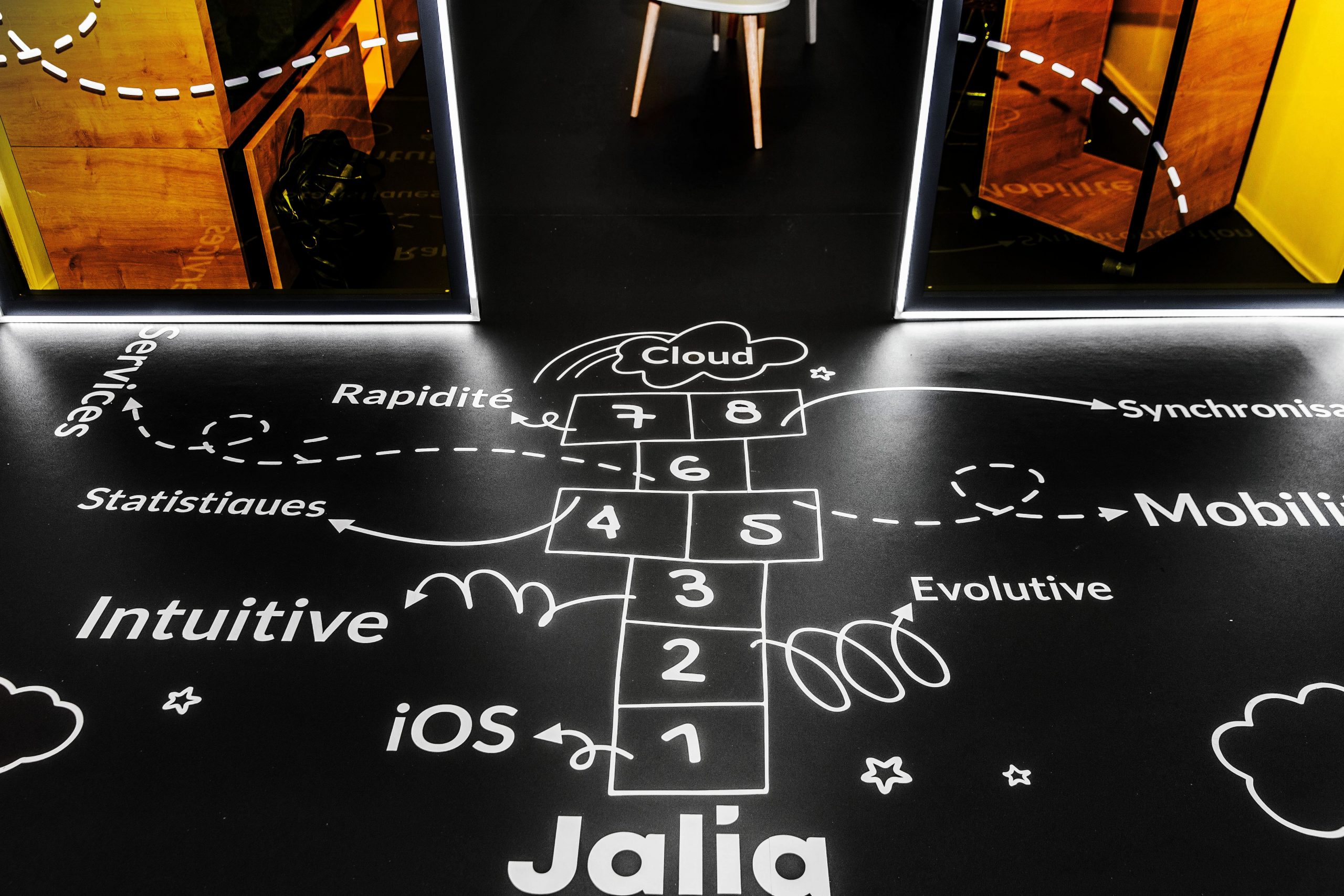 Au sol, une marelle graphique guide le visiteur jusqu’à l’intérieur de la box.