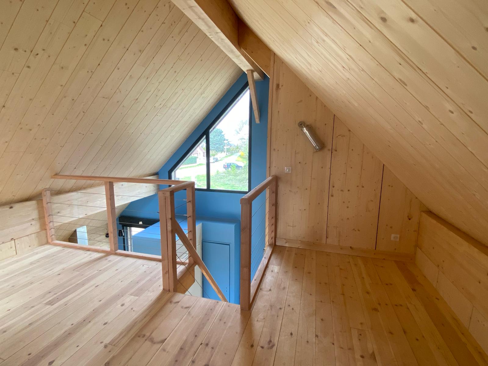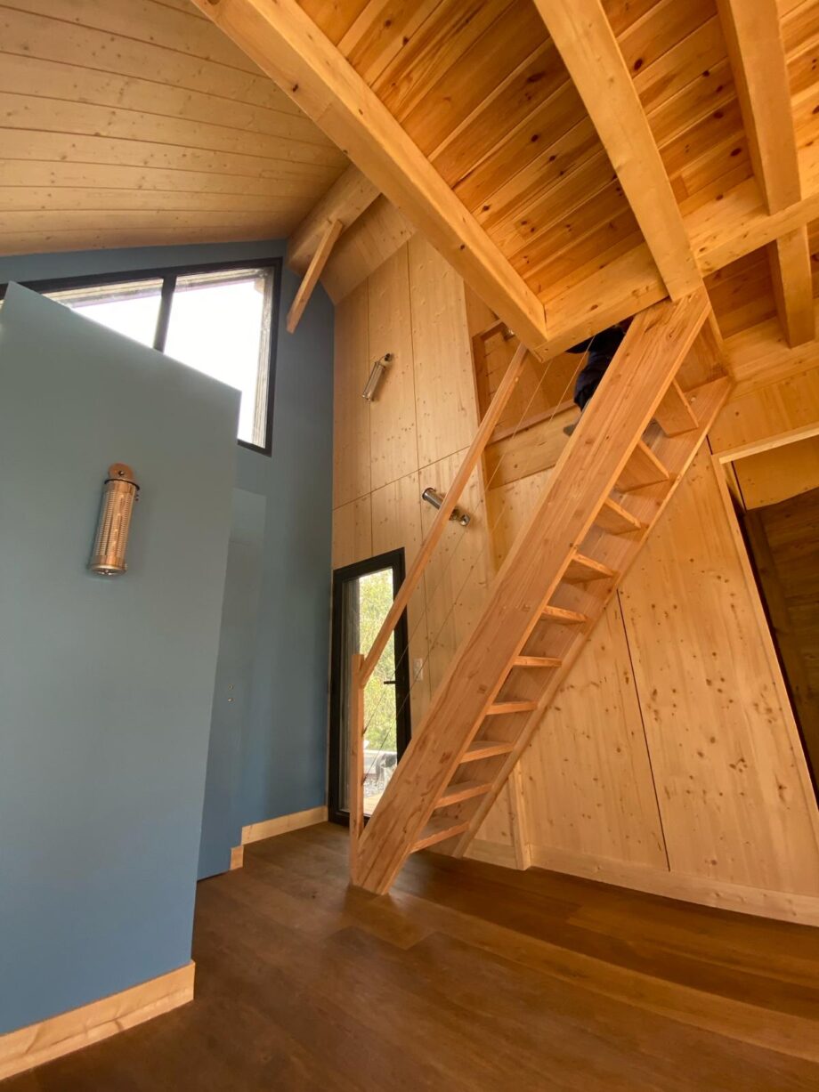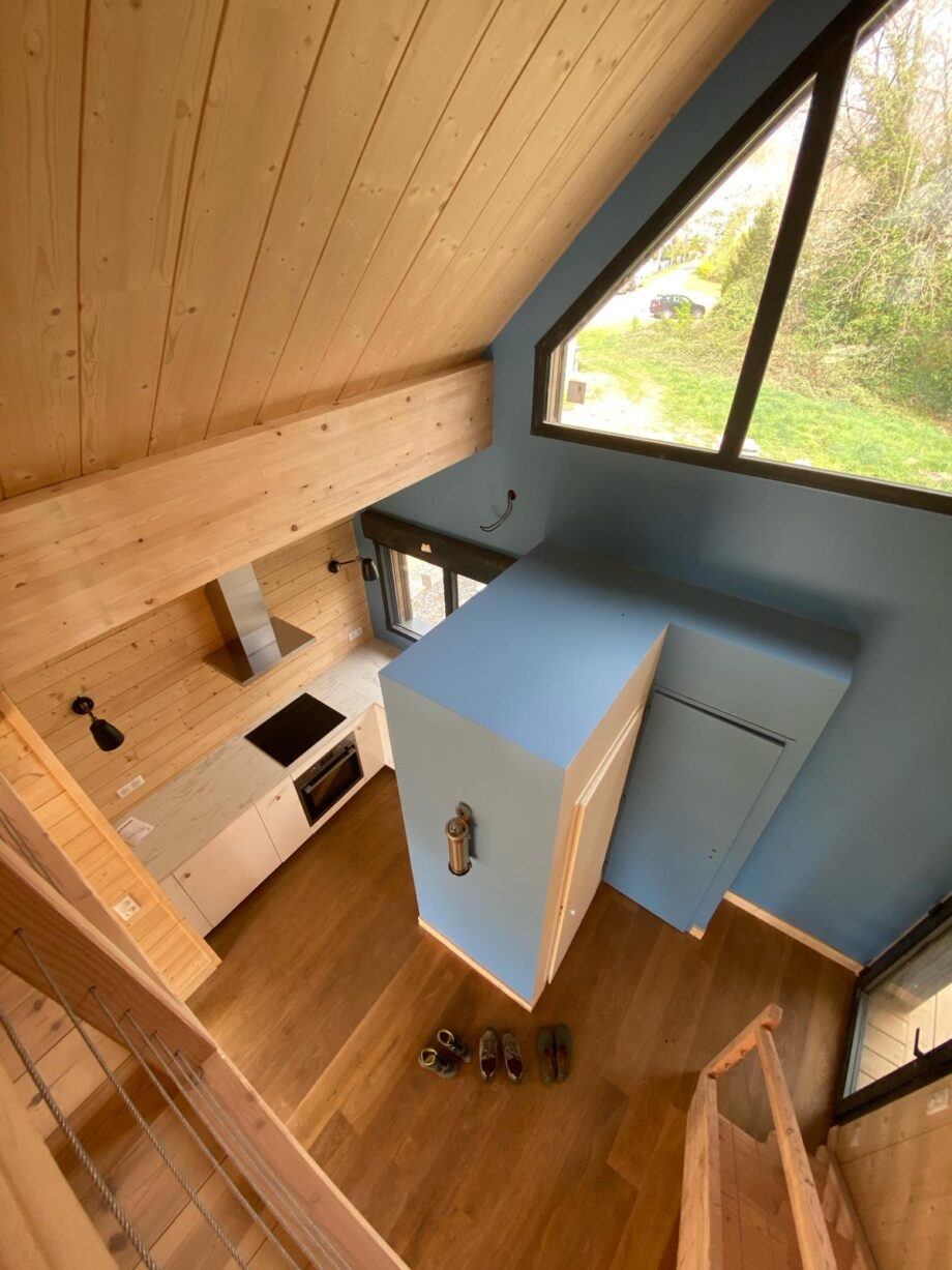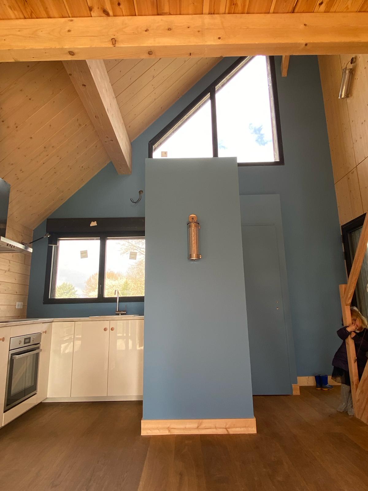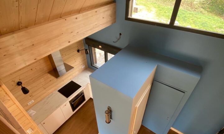 Du bois, du bois et encore du bois, mais que du bois de pays…tel était notre ligne directrice pour la réalisation de ce projet. Nous avons imaginé celui-ci pour coller au plus près possible de son environnement naturel au cœur des Pyrénées. Principalement travaillé avec des éléments en panneaux de triply en plafonds et murs afin d’obtenir un design épuré, le parquet en chêne vieilli et les portes en vieux bois réhaussent le ton et contrastent avec le triply. Les pignons vitrés et les larges menuiseries augmentent les apports thermiques en hiver et permettent d’obtenir une luminosité traversante incroyable. Une pointe de bleu Farrow & Ball et des appliques indus de chez Sammode ajustent la pureté et le caractère de cette Tiny.