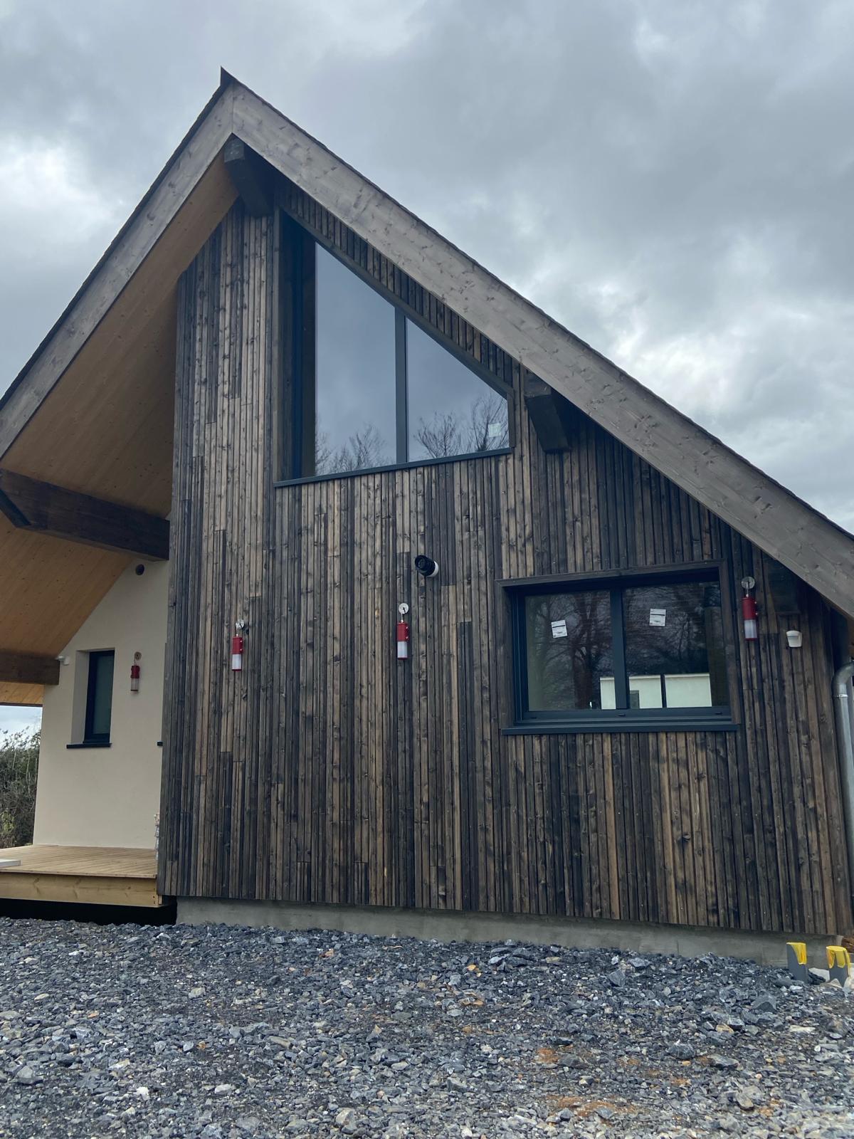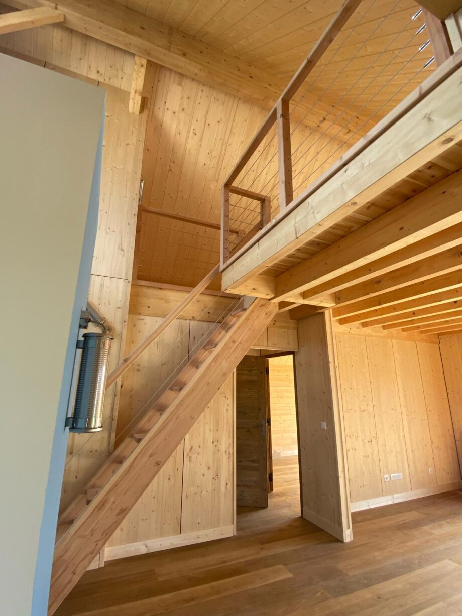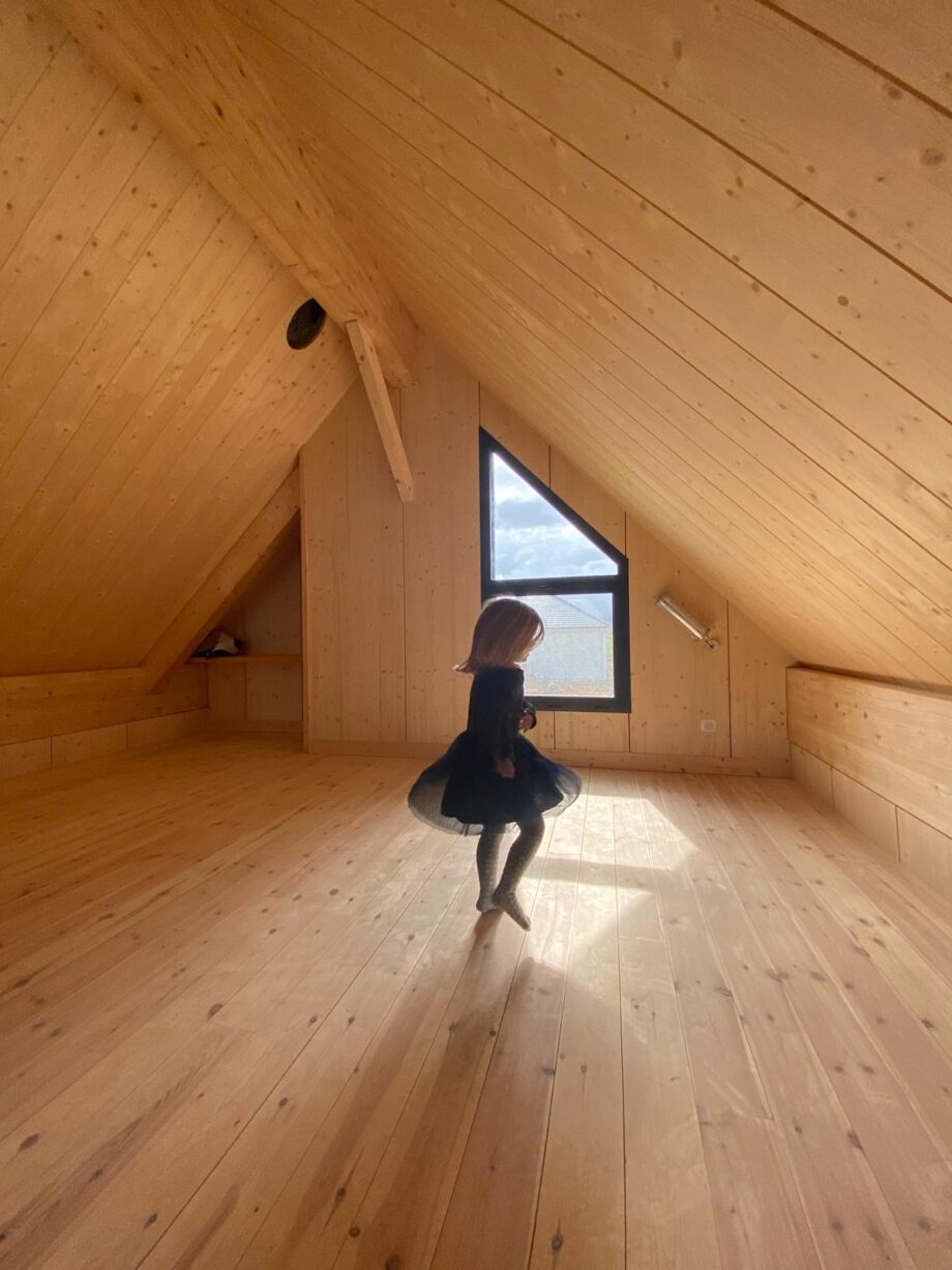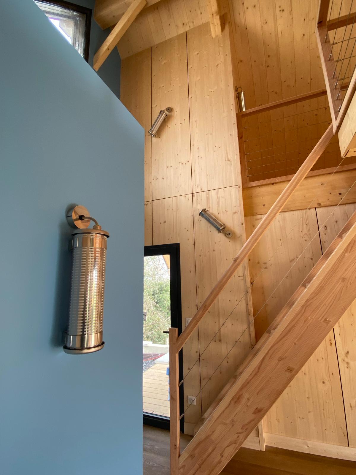 Du bois, du bois et encore du bois, mais que du bois de pays…tel était notre ligne directrice pour la réalisation de ce projet. Nous avons imaginé celui-ci pour coller au plus près possible de son environnement naturel au cœur des Pyrénées. Principalement travaillé avec des éléments en panneaux de triply en plafonds et murs afin d’obtenir un design épuré, le parquet en chêne vieilli et les portes en vieux bois réhaussent le ton et contrastent avec le triply. Les pignons vitrés et les larges menuiseries augmentent les apports thermiques en hiver et permettent d’obtenir une luminosité traversante incroyable. Une pointe de bleu Farrow & Ball et des appliques indus de chez Sammode ajustent la pureté et le caractère de cette Tiny.