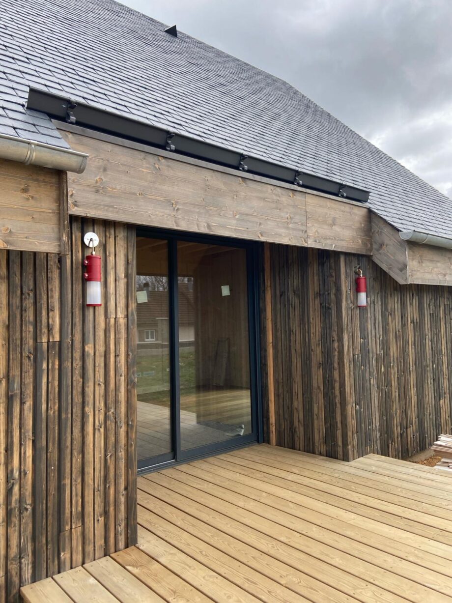 À l’extérieur, la toiture en Ardoise des Pyrénées avec ses longs avants toits qui lèchent le sol, protège la Tiny de la rigueur de l’hiver.